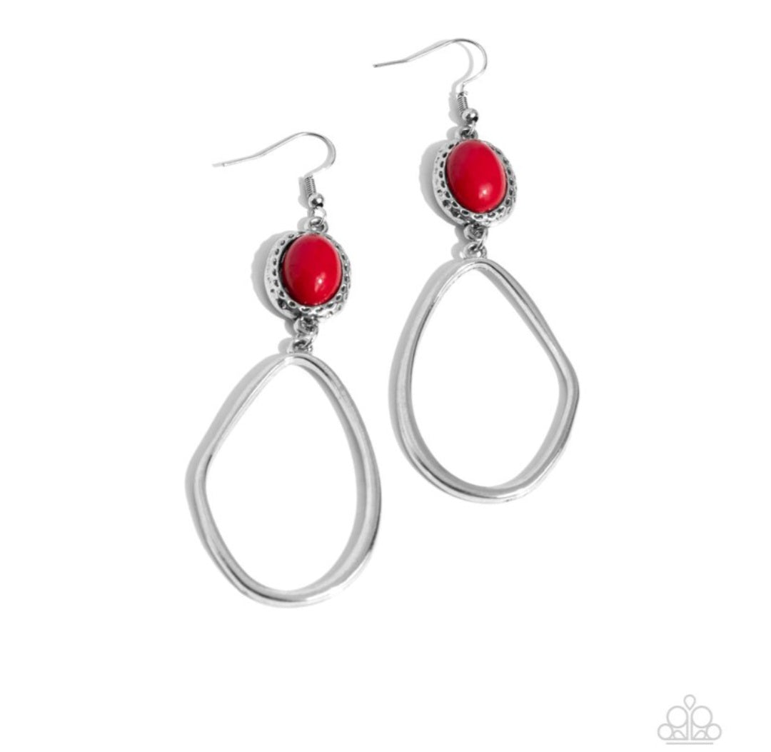 An asymmetrical silver oval swings from the bottom of a red beaded silver frame featuring hammered textures, creating a colorfully rustic lure. Earring attaches to a standard fishhook fitting.