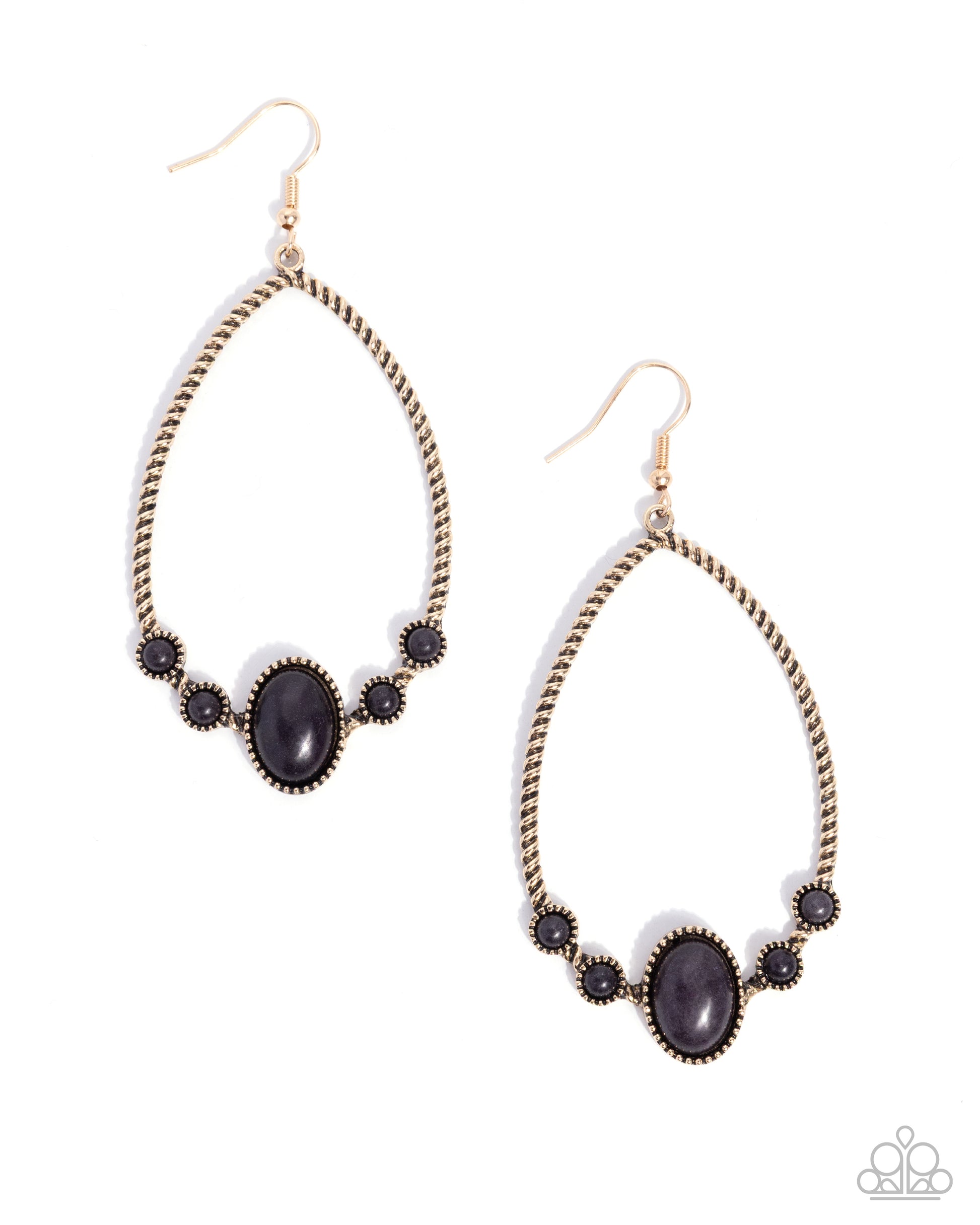A twisted gold teardrop frame showcases an oval black stone centered between two pairs of round black stone accents. Brushed in an antiqued finish, the rope-like border adds subtle texture, creating a rustic artisan flair below the ear. Earring attaches to a standard fishhook fitting. As the stone elements in this piece are natural, some color variation is normal.