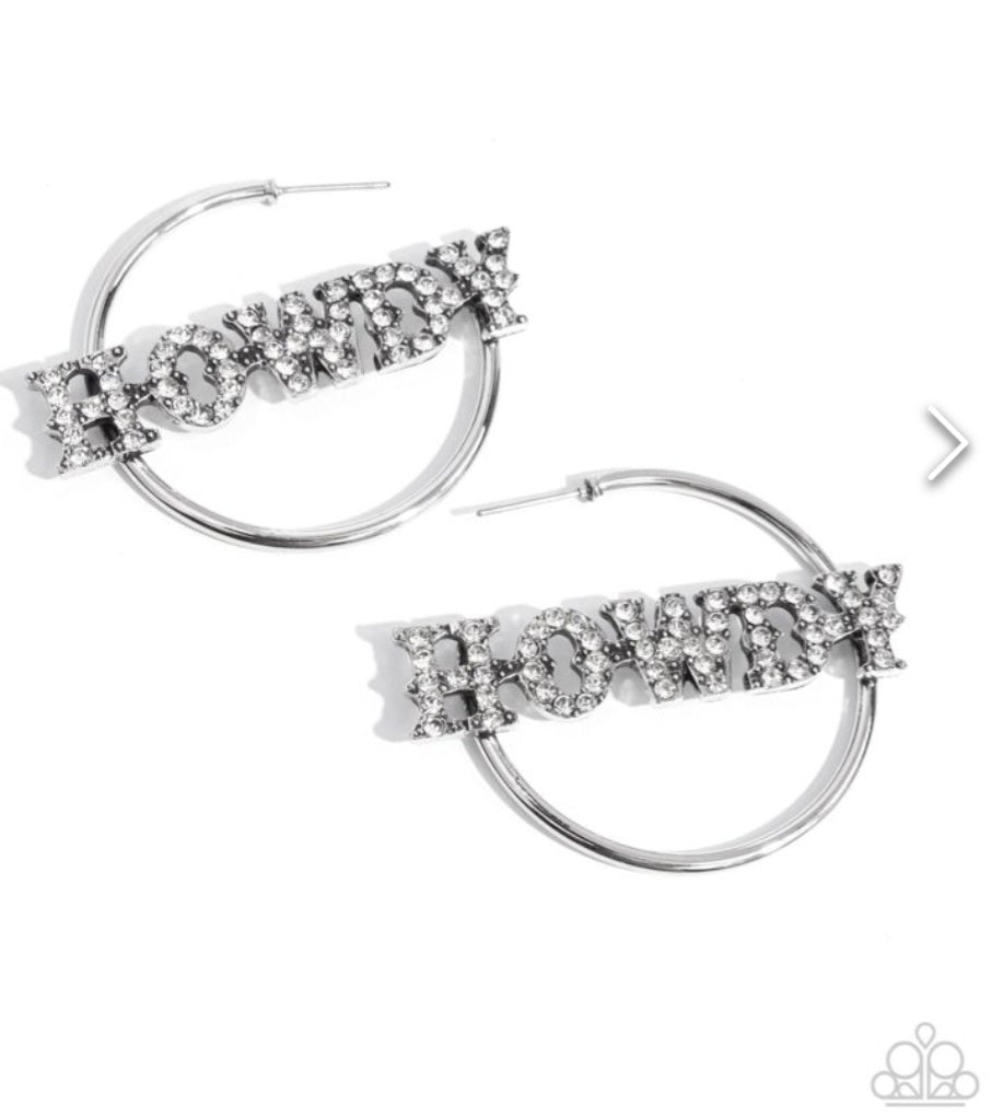 Dusted in sparkling white rhinestones, the word "HOWDY" in a western-inspired serif font accents and goes across a sleek silver hoop, creating a playful and eye-catching look. Earring attaches to a standard post fitting. Hoop measures approximately 2" in diameter.