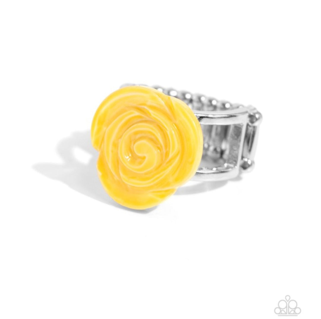 Featured in the center of an airy silver band, a yellow rosette is formed from shiny shell petals for a blooming basic atop the finger. Features a stretchy band for a flexible fit.